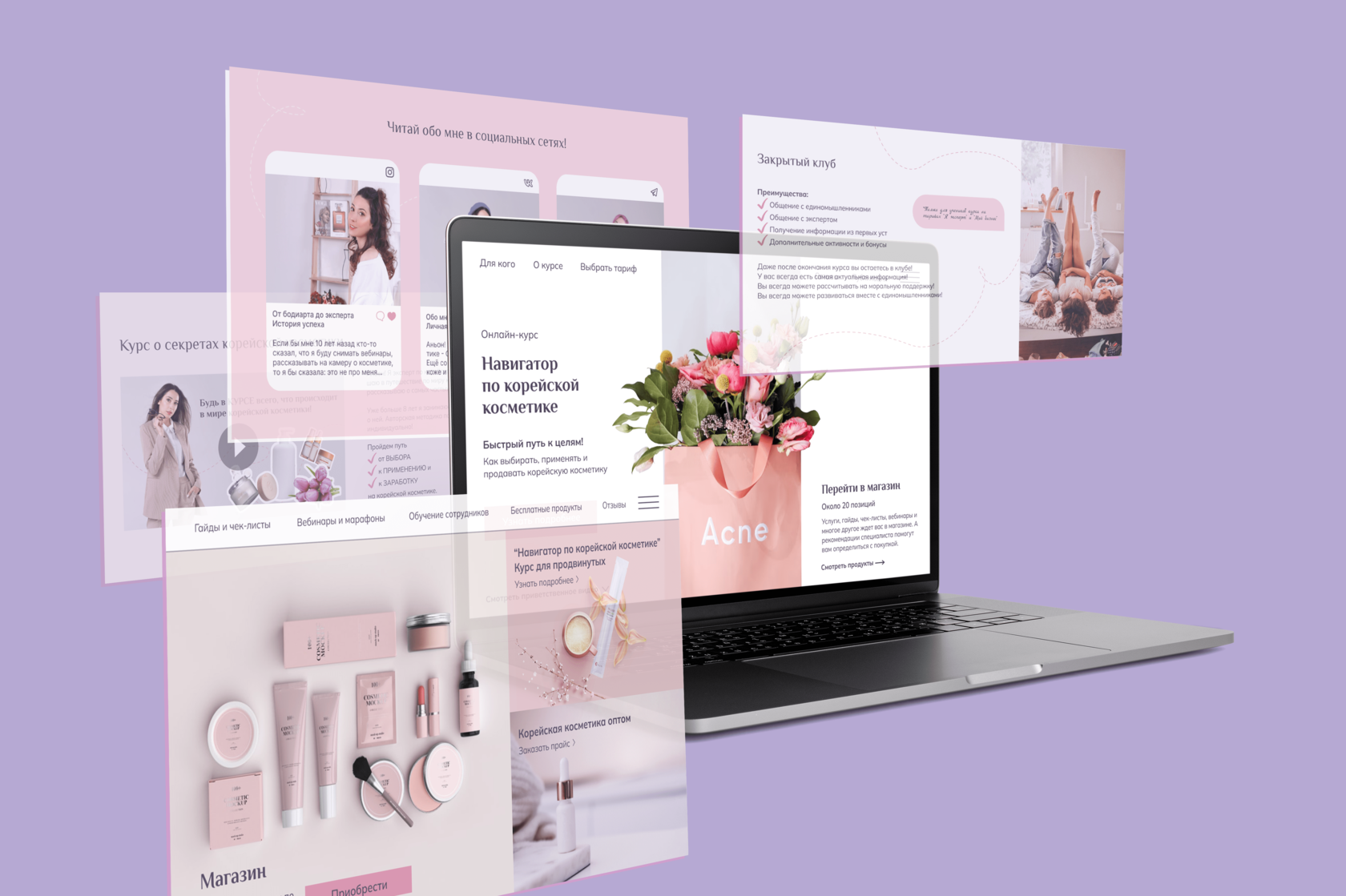 A multi-page website for products and services about Korean cosmetics. The task was to attract customers to the page, introduce customers to the expert, sell the basic course, and familiarize them with other services and products. The design is made with all the wishes of the customer - a romantic classic, gentle and light, for true ladies and connoisseurs of beauty.