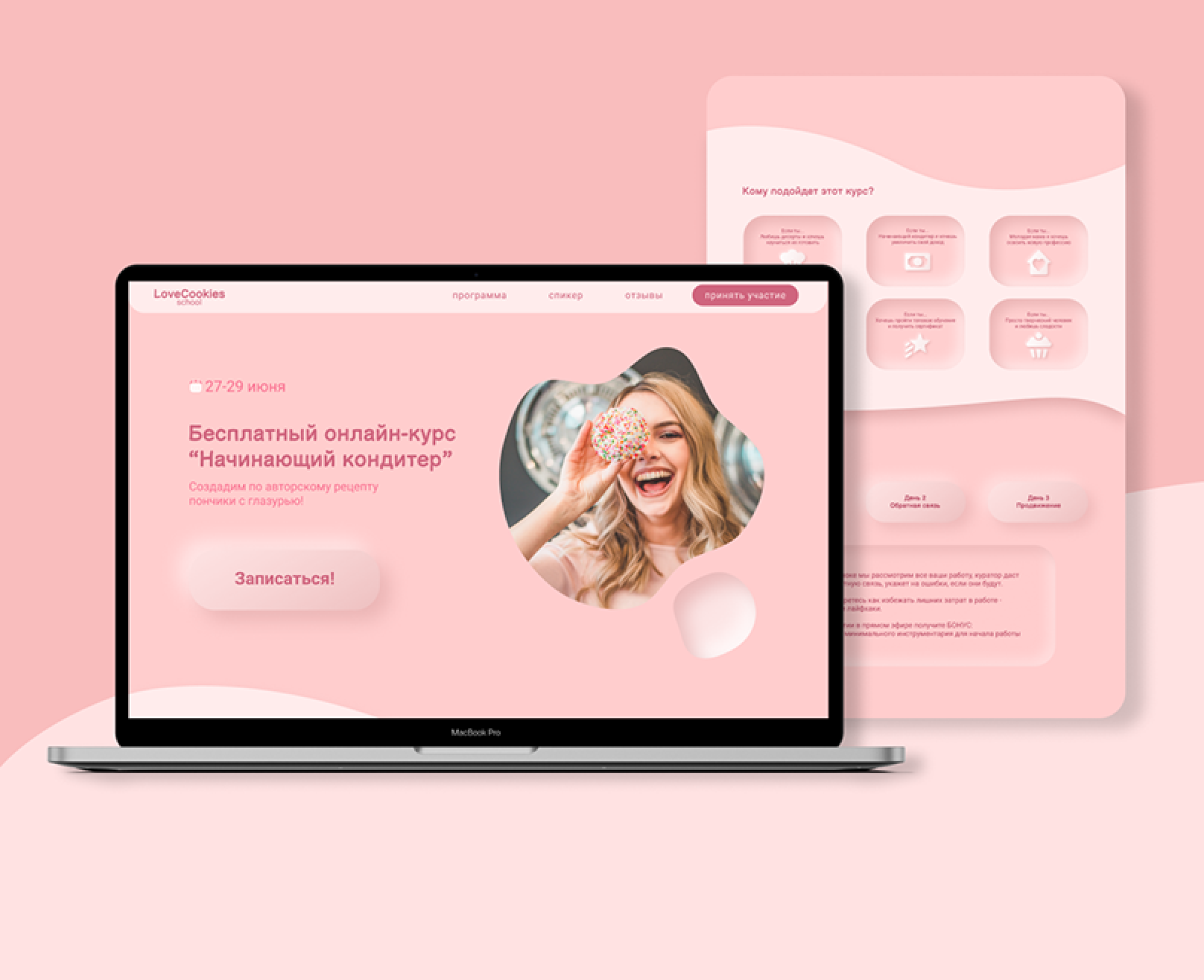 Design of Landing Page for a free online course on confectionery. Colors and shapes should be gentle and smooth, airy. Landing Page is made in pink, pale shades to give a feeling of lightness. The neomorphism effect is designed to emphasize the simplicity and relevance of the course.