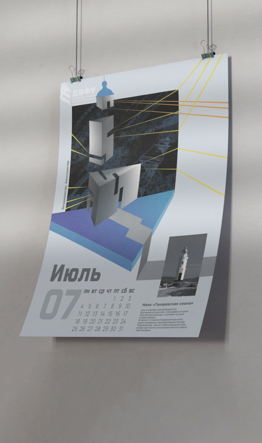 Development of graphics for the calendar. The author's idea is an extraordinary presentation of the sights of the city through various geometric shapes. Rough lines and muted tones, an abundance of straight lines and clarity of rhythms set a certain character of this graphic series. All this reflects the life of such a bright city as Vladivostok.